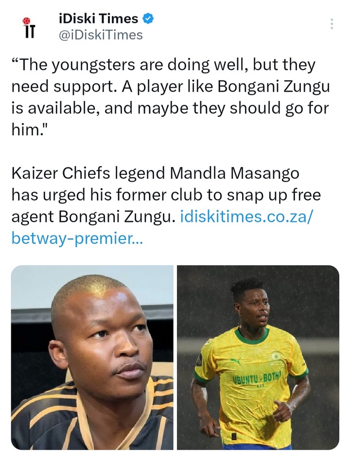 Kaizer Chiefs legend Mandla Masango has encouraged his former club to consider signing Bongani Zungu, who is currently a free agent. Masango, who enjoyed a successful stint with Chiefs, shared his thoughts on the club’s need for an experienced player to support their young squad. “The youngsters are doing well, but they need support,” Masango commented, emphasizing that Chiefs’ youthful talents could benefit significantly from the guidance and presence of a seasoned professional like Zungu.