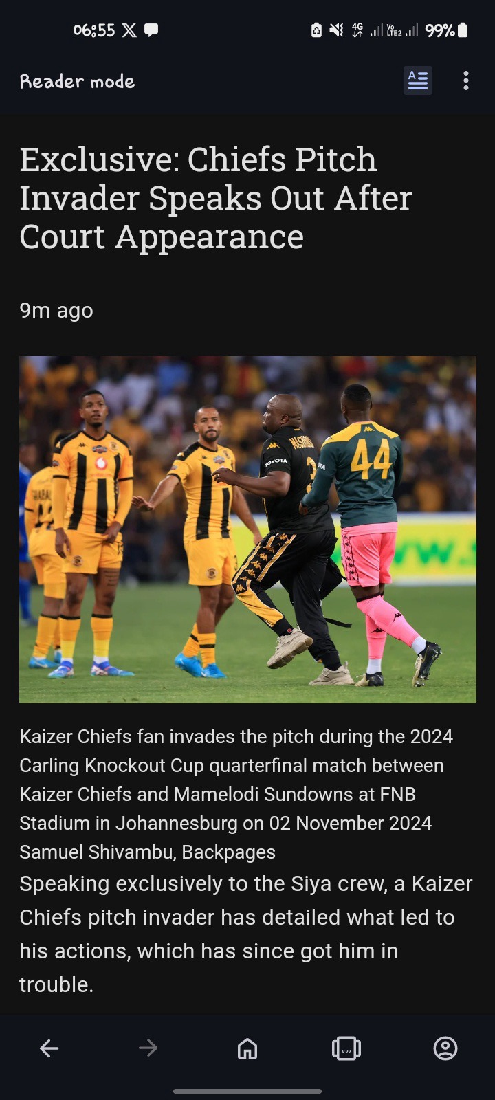 "My frustration began when I felt as though we had been robbed," he said. Nevertheless, he has come to terms with the fact that his behaviour was unacceptable. Mashonisa had already tried to assault the pitch earlier in the game. Chiefs goalkeeper Bruce Bvuma stepped in and told him to calm down after he was detained by fellow fans the first time he tried to get to the pitch. "'Mashonisa, leave him alone.'" Bvuma told me.