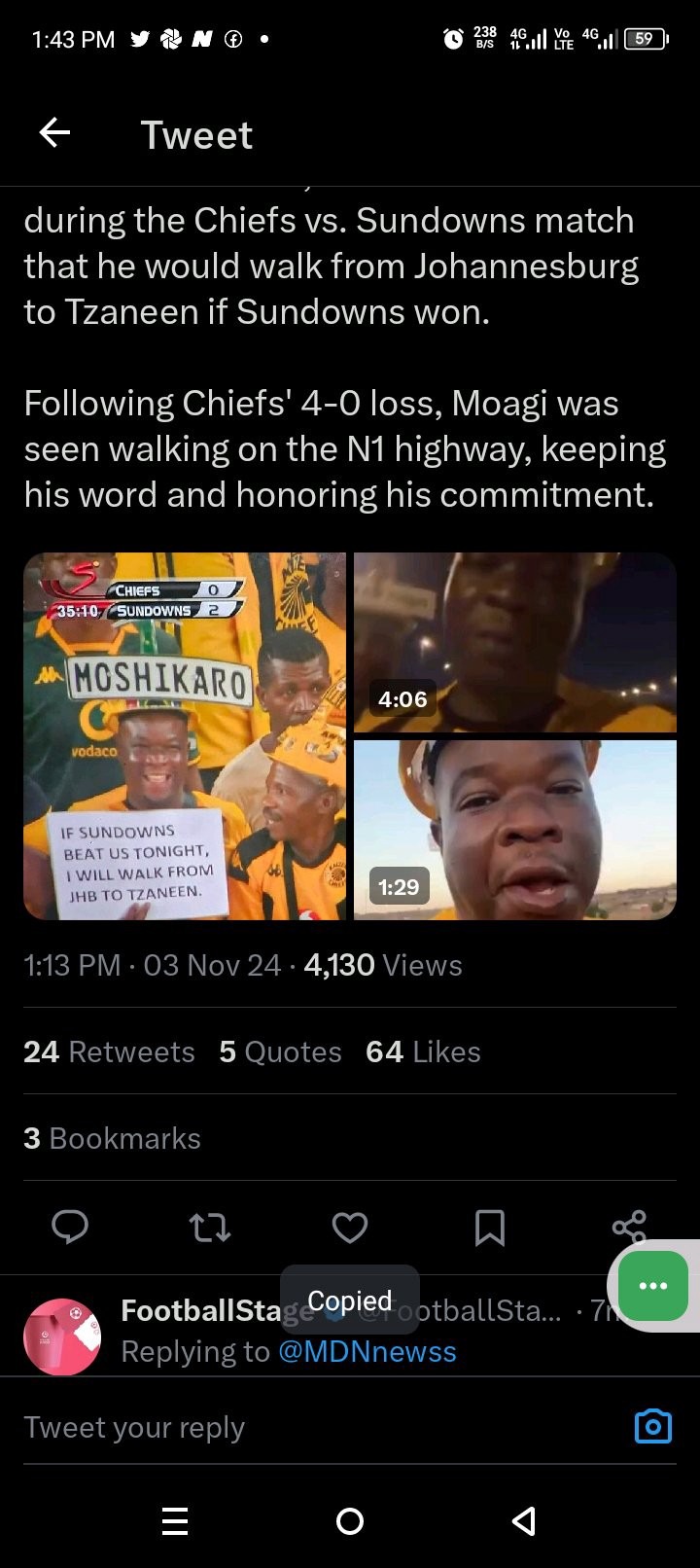 Moagi's walk has fostered discussions regarding South Africa's sports culture and loyalty, prompting enquiries regarding the extent to which supporters will go to prove their devotion to their teams. Many Kaizer Chiefs supporters and players have shared posts encouraging him to remain safe on his voyage, as his dedication has not gone unnoticed. Despite the fact that some individuals have expressed apprehensions regarding his safety due to the extensive distances and heavy traffic along the route, the prevailing sentiment has been one of admiration and pride in his fortitude.