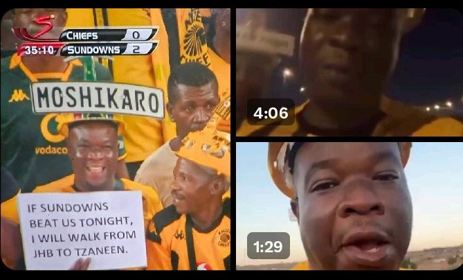 Moshikaro Moagi, a devoted supporter of Kaizer Chiefs, has captivated the attention of South Africans with his extraordinary exhibit of dedication and passion for his team. He has pledged to trek from Johannesburg to his hometown of Tzaneen in Limpopo. Moagi made the unusual pledge during the highly anticipated DStv Premiership clash between Kaizer Chiefs and Mamelodi Sundowns, stating that he would travel the significant distance if Chiefs were defeated. Moagi remained steadfast in his commitment to his word, undertaking a voyage that has garnered widespread support, curiosity, and admiration on social media, as Sundowns emerged as clear victors in a 4-0 victory