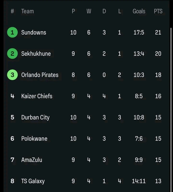 The DStv Premiership table is beginning to take clear shape as the battle for top positions intensifies. Orlando Pirates remain firmly in contention, sitting just three points behind current leaders Mamelodi Sundowns. The Soweto outfit has displayed impressive consistency in recent fixtures, keeping their title ambitions alive. However, closing the gap on Sundowns will require near-perfect performances in the coming weeks, as the defending champions continue to set a high standard at the summit of the league.