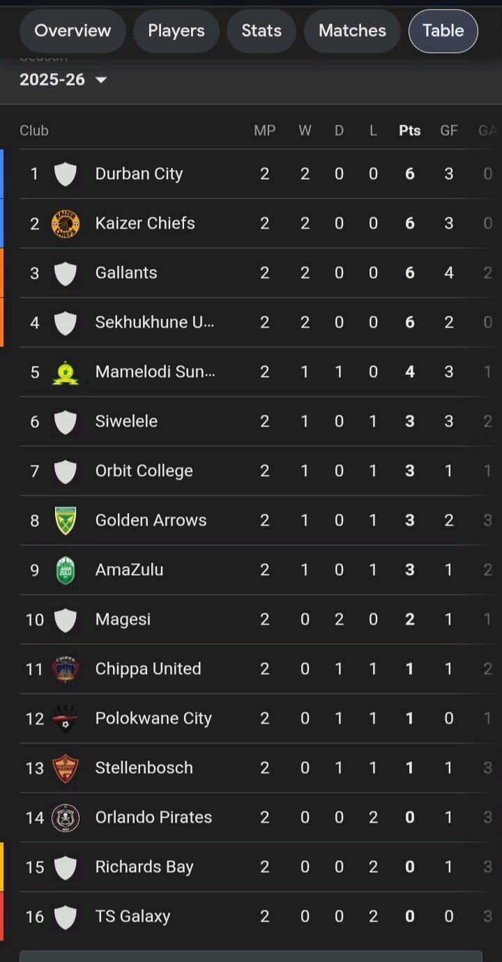 Kaizer Chiefs also secured a 1-0 win against Polokwane City, earning them six points and second place. Despite matching Durban City’s points, their inferior goal difference keeps them in second, but the victory signals their intent to challenge for the title. Marumo Gallants, previously table-toppers, slipped to third without playing, overtaken by the midweek results. Sekhukhune United climbed to fourth after a narrow 1-0 win over TS Galaxy, who remain pointless at the bottom of the table, struggling to find form after two losses.